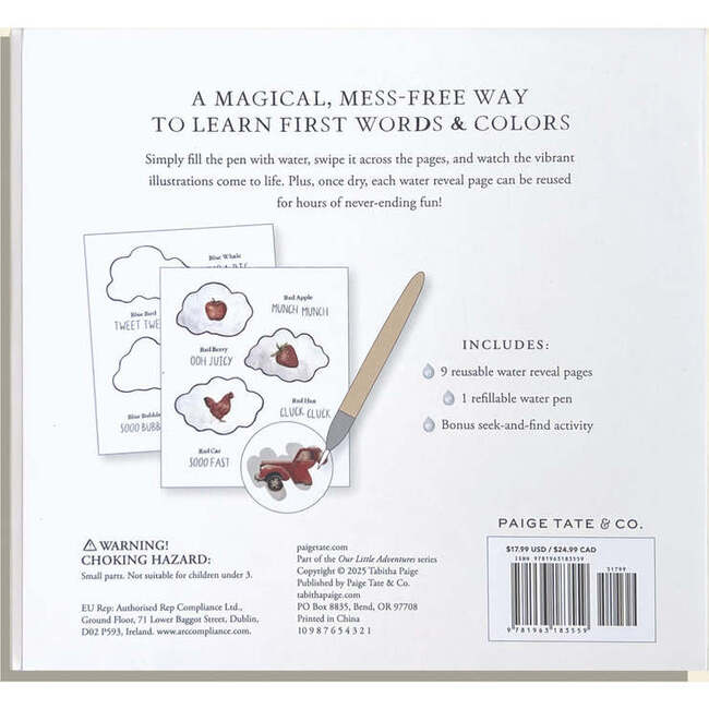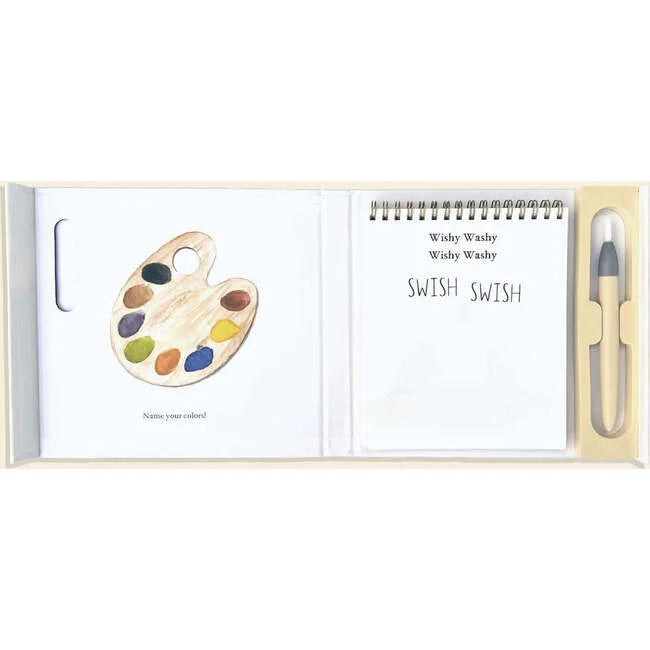 Accelerate your toddler's education in first words and colors using this engaging story from professional artist and licensed speech therapist Tabitha Paigenow reimagined as a fun, reusable water reveal activity book! Wishy Washy takes young children on an adventure as they learn new words through life-like paintings, bright colors, and an animal friend who guides them along the way. Now in an interactive water reveal book edition, this book can help you teach your child first words as they enjoy bringing the pages to life themselves with color using the included kid-friendly water pen. Features: Reusable Water Reveal Coloring Pages: 9 coloring pages turn from black and white to brilliant hues with just a touch of water. Once dry, the pages return to their original state, ready to be painted again and again. Kid-Friendly Water Pen: The chunky, easy-to-fill water pen is perfect for little hands, ensuring a comfortable grip and easy use. Plus, it conveniently stores right in the spiral-bound book, making it ideal for travel. Travel-Friendly Activity Pad: Perfect for on-the-go fun, making it easy to entertain kids during road trips, flights, or waiting rooms. Eco-Friendly: Use again and again without wasting paper. Skill-Building Fun: While having fun with colors, your child will also develop fine motor skills through sensory exploration. So join our little chipmunk friend on a creative adventure as he takes your child through this first words book in a fun and interactive way!
