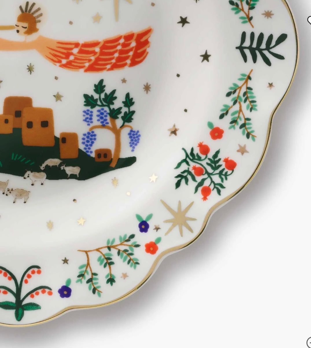 Something special for your holiday table. Intricate, Nativity-inspired illustrations adorn these shimmering porcelain dessert plates, featuring metallic gold accents and gold-painted edges.