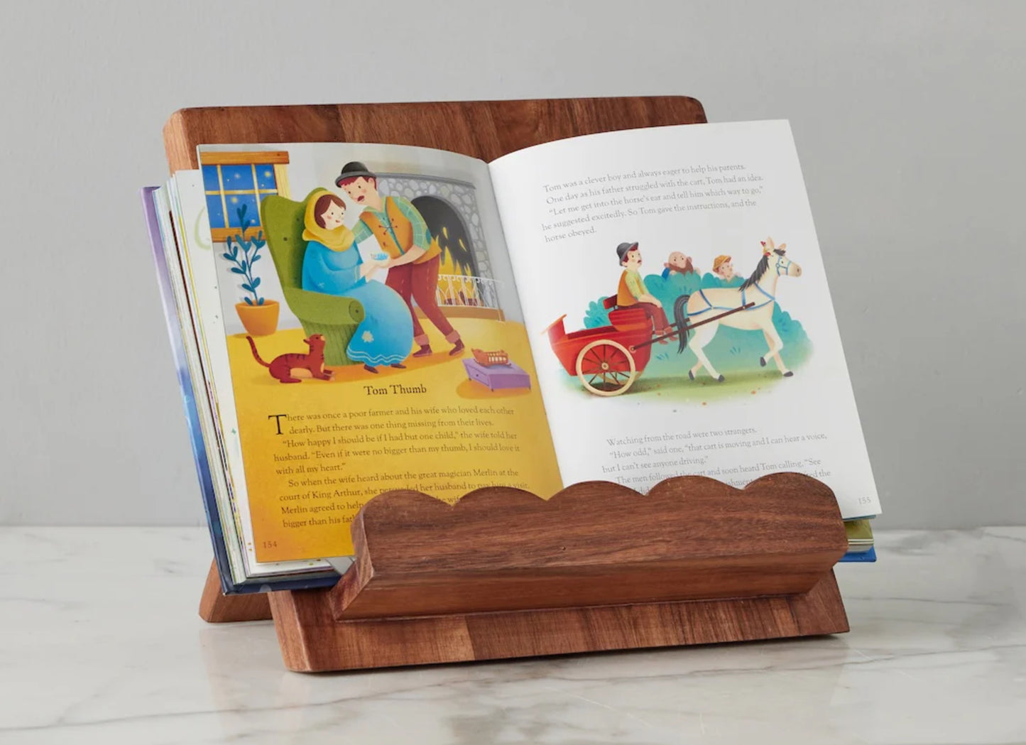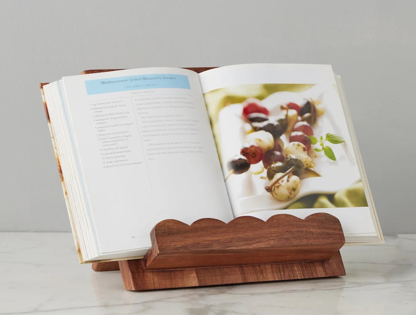 A supreme example of beauty meets function, our chic and practical Scalloped Cookbook Holder is a countertop staple. Crafted from richly grained acacia wood, each stand features unique wood patterns, showcasing the beauty of sustainable materials and artisanal craftsmanship. The ledge features a timeless scalloped edge, adding visual interest and charm to your counter. Perfect for showcasing your favorite recipes in the kitchen, organizing important paperwork at your desk, or keeping a beloved storybook on display in a playroom.