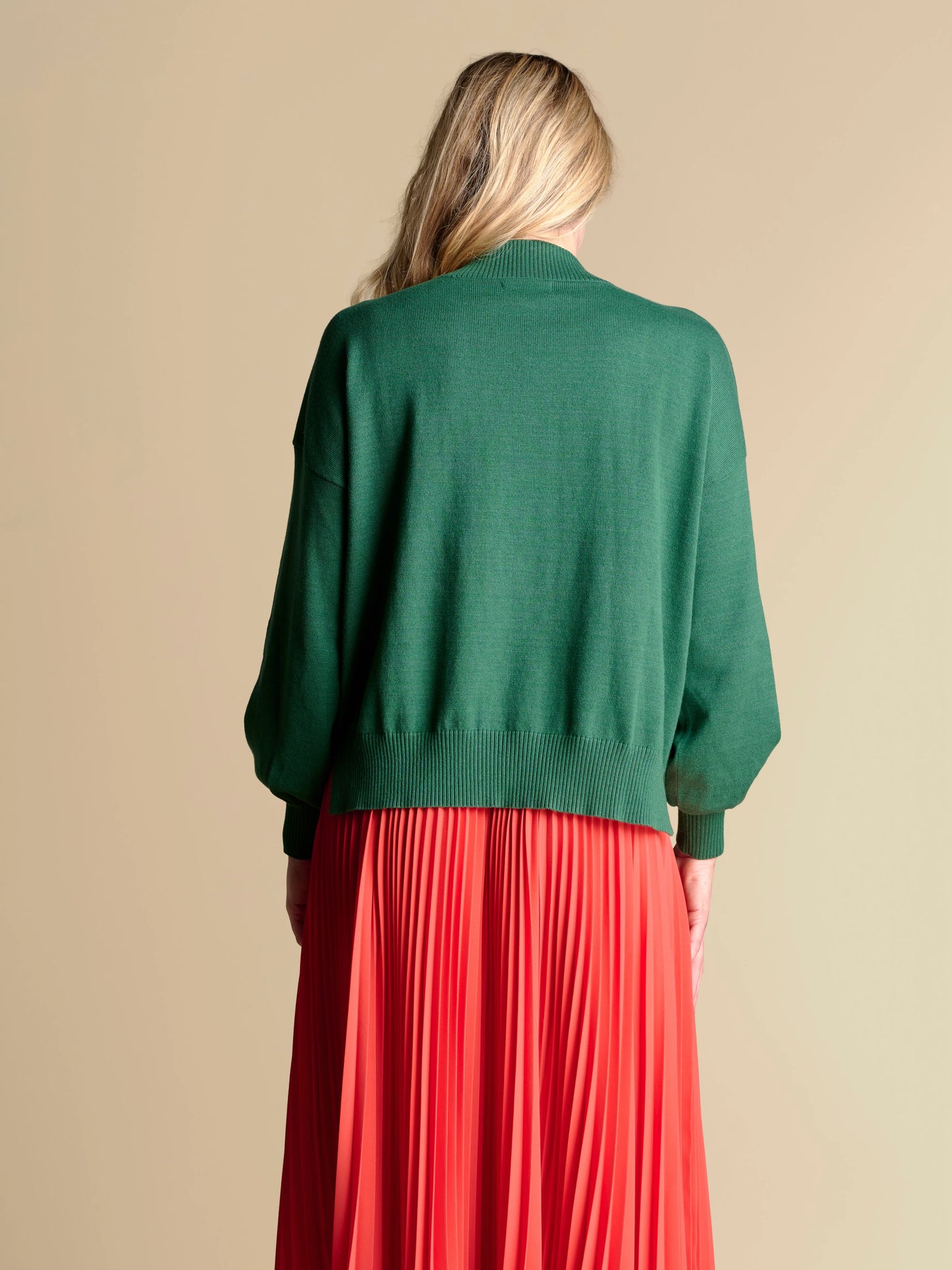 -Chunky rib trim at neckline, cuffs, and hemline