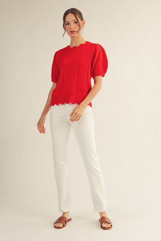 Brighten your wardrobe with this stunning poppy red knit top, designed to turn heads with its charming details. The scalloped neckline and hem add a touch of whimsy, while the puff sleeves bring playful dimension to your look. Crafted from lightweight fabric, it's perfect for layering or wearing solo—ideal for everything from casual outings to weekend adventures. A versatile piece that feels as good as it looks.