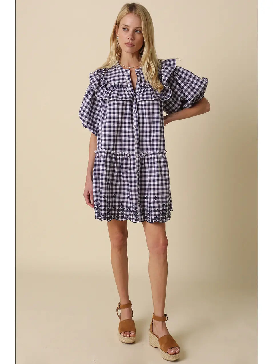 Introducing the Genevieve Gingham Tiered Dress—a charming wardrobe essential for warm-weather days. This button-up style features a classic navy and white gingham check pattern with delicate ruffle detailing and intricate eyelet embroidery along the hemline. The tiered silhouette creates effortless movement and dimension, while 100% cotton fabric keeps you cool and comfortable. Perfect for spring and summer, this dress transitions beautifully from casual outings to relaxed gatherings. A versatile piece that celebrates timeless style with thoughtful details.