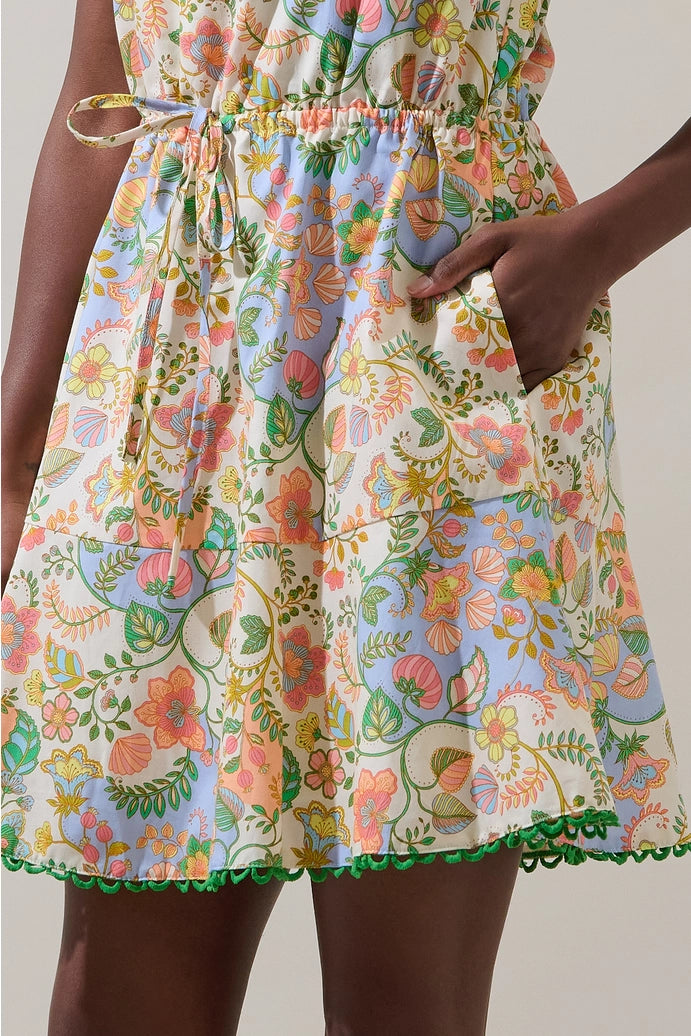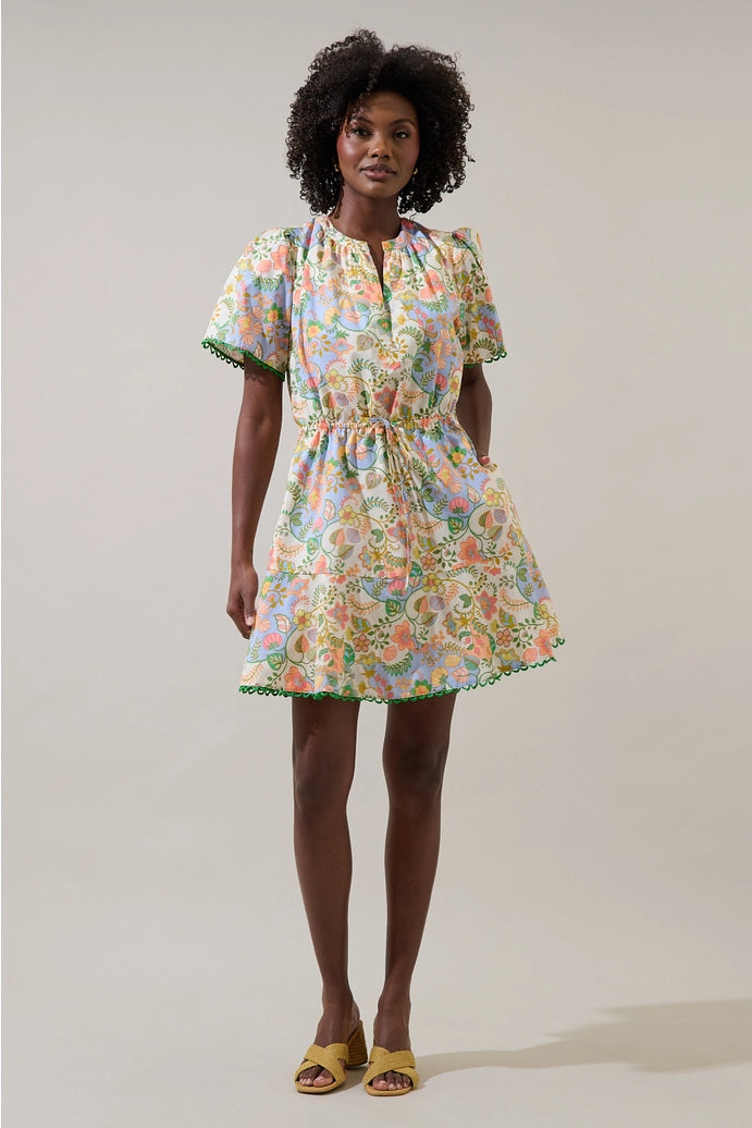Receive lots of compliments when you wear this mini dress. Short sleeves with pleated shoulders frame a split neckline. The waist has a drawstring waist belt and ends at a mini hem. Pair the dress with white heels for a cute look. - Mini - Floral - Short sleeve - Drawsting waist - Size + Fit - Model is 5'9" and wearing size XS - Measurements taken from size S - Chest: 20" - Length: 35 1/2"