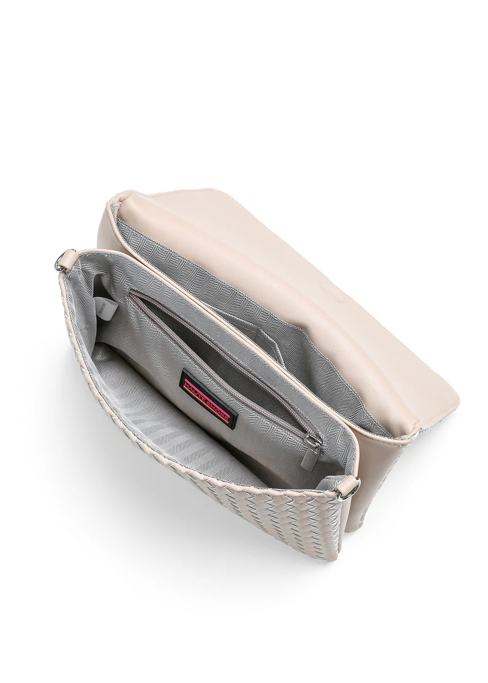 Flap crossbody with 2 accordion segments. Exterior back slip pocket. Interior slip and zip pockets.