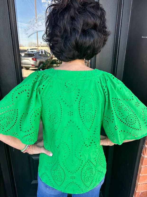 Elevate your wardrobe with this charming kelly green eyelet blouse that's equal parts elegant and fun. The delicate eyelet lace creates an airy, romantic vibe, while flutter sleeves add a playful touch that catches the light beautifully. A notched V-neckline with solid contrast trim flatters every frame and keeps things polished. Perfect for brunch dates, garden parties, or whenever you want to feel effortlessly put-together with a hint of whimsy.