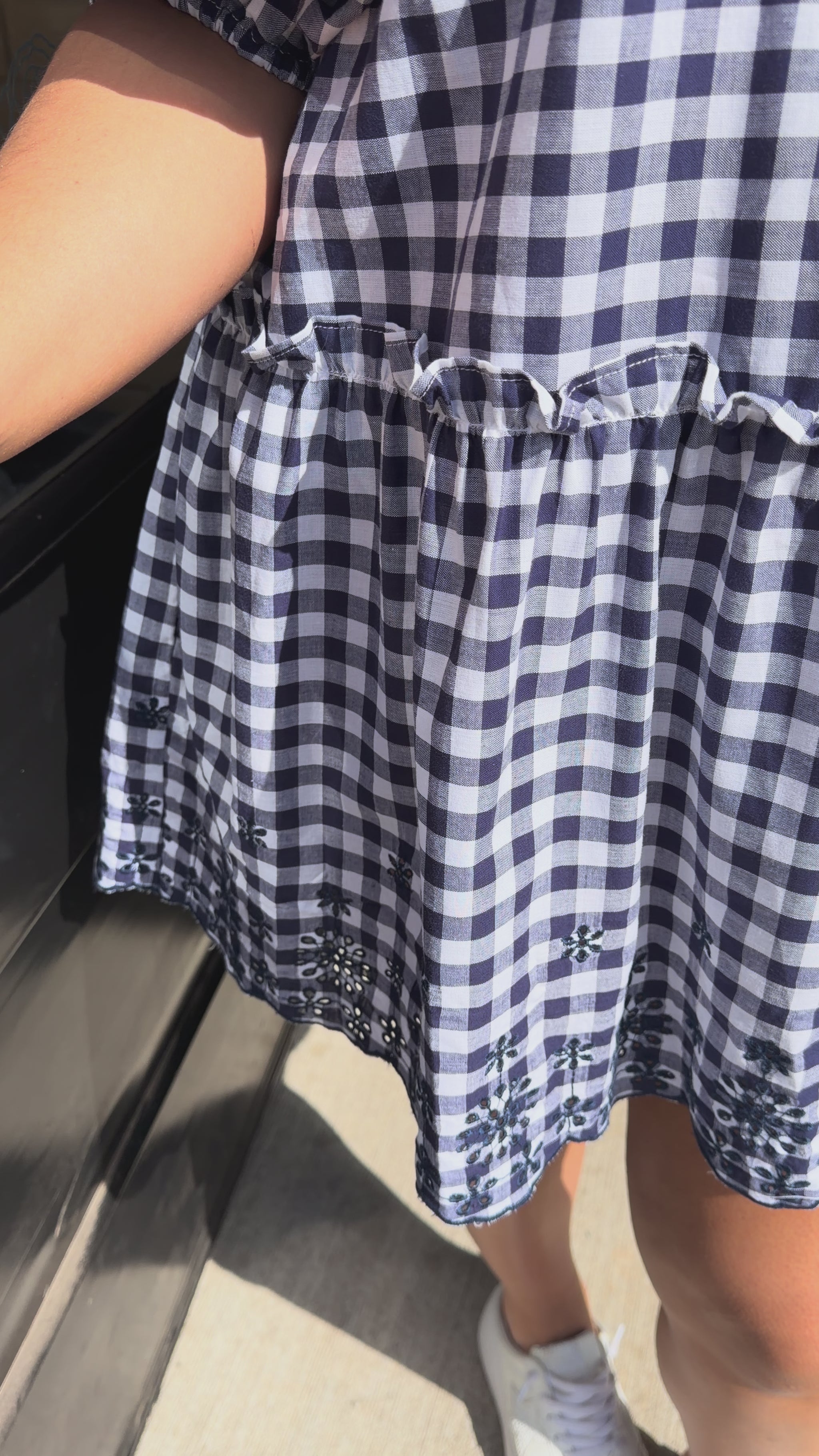 Introducing the Genevieve Gingham Tiered Dress—a charming wardrobe essential for warm-weather days. This button-up style features a classic navy and white gingham check pattern with delicate ruffle detailing and intricate eyelet embroidery along the hemline. The tiered silhouette creates effortless movement and dimension, while 100% cotton fabric keeps you cool and comfortable. Perfect for spring and summer, this dress transitions beautifully from casual outings to relaxed gatherings. A versatile piece that celebrates timeless style with thoughtful details.