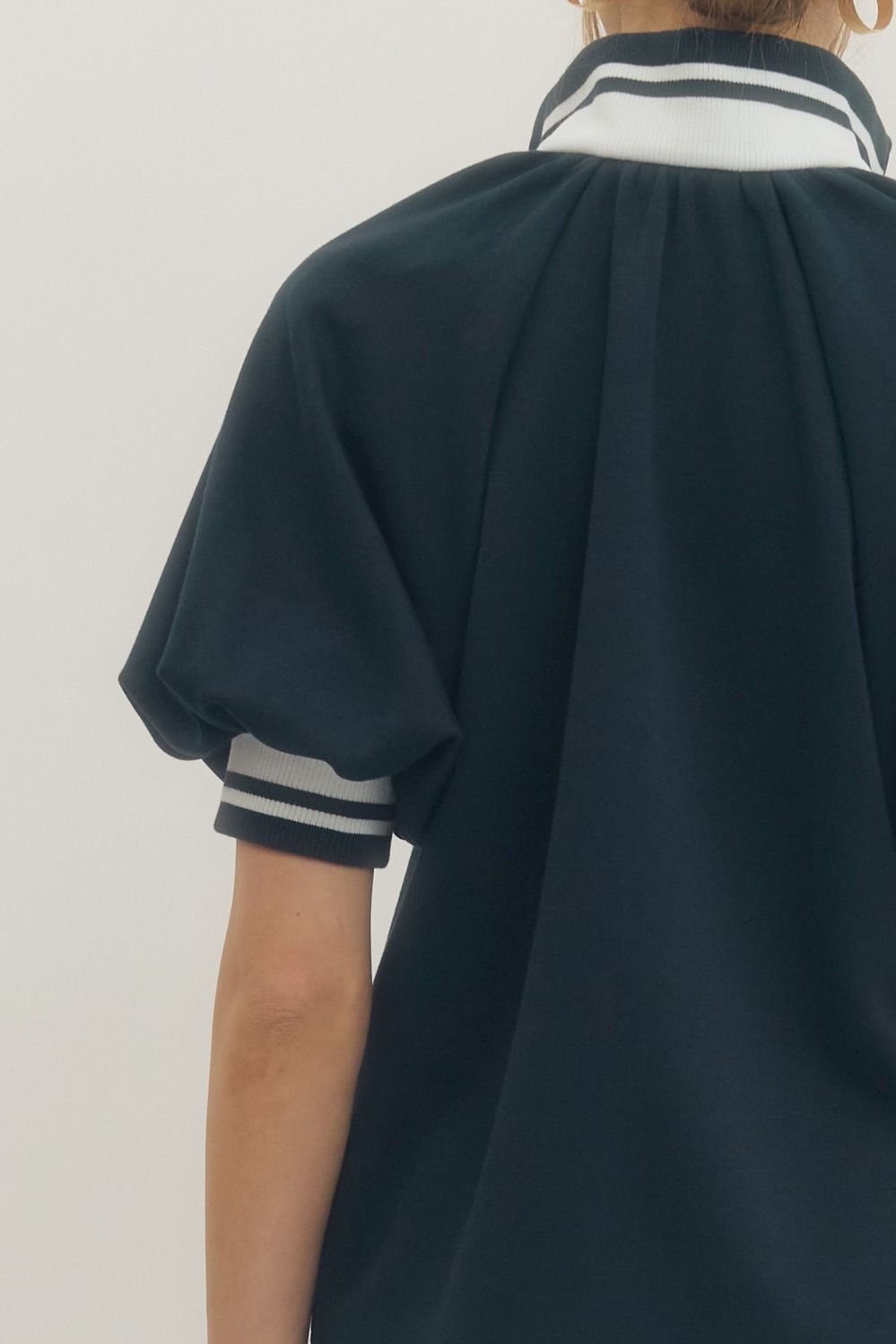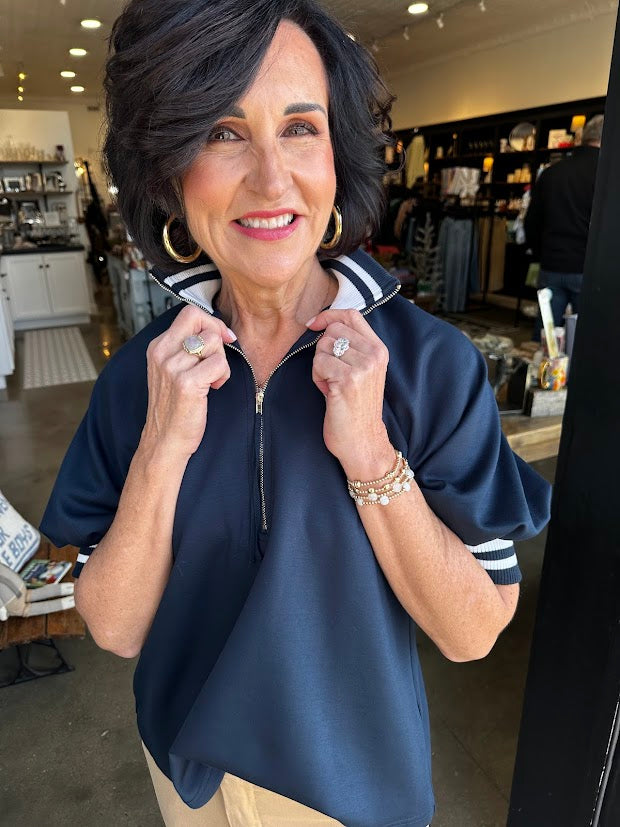 Elevate your casual wardrobe with the Blaire Navy Stripe Knit Top—a cozy essential that doesn't take itself too seriously. This navy knit features a charming stand collar with a half-zip for easy layering, paired with crisp white striped rib trim at the collar and cuffs for a preppy pop. Practical side pockets keep your hands happy, while the unlined construction keeps things light and breathable. Perfect for weekend adventures or laid-back office days.