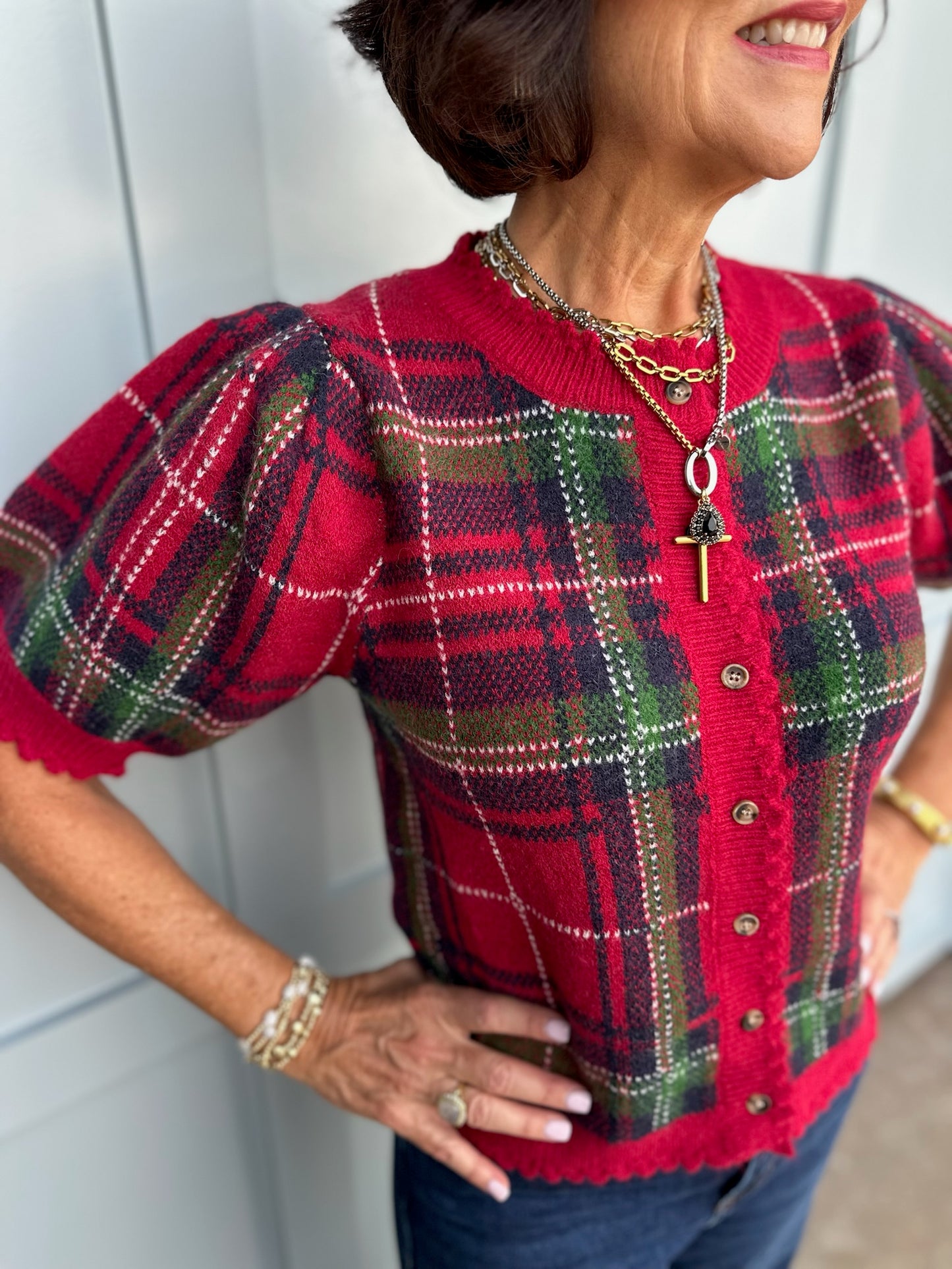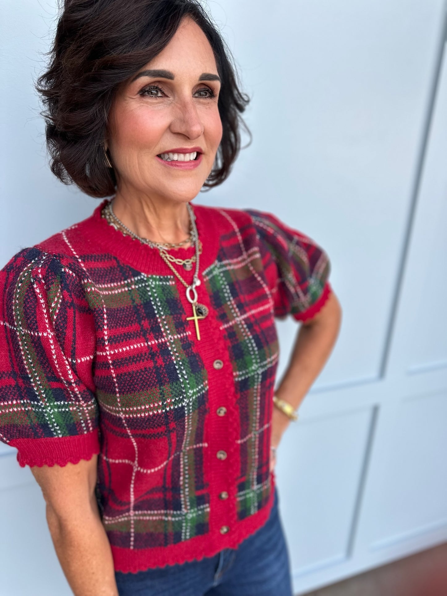 The Glad to be Plaid Sweater features a classic plaid design with elegant scallop trim and gold buttons. Perfect for the holiday season and beyond, this sweater is soft and true to size. Upgrade your wardrobe with this versatile and stylish piece.