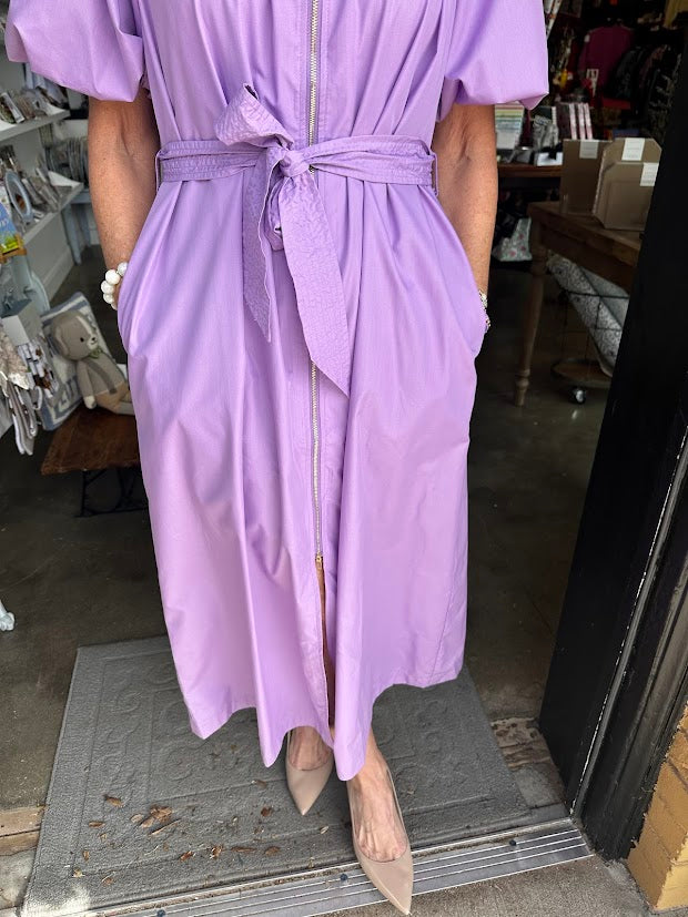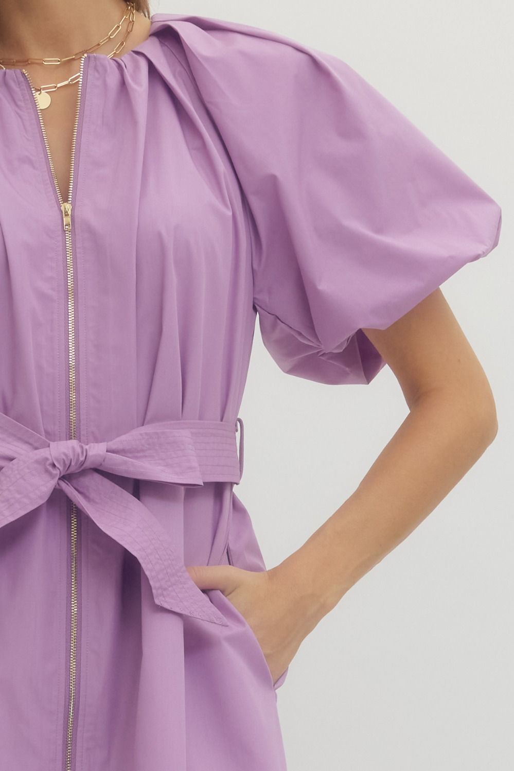 Slip into effortless elegance with this lavender midi dress that's equal parts chic and comfy. The gathered neckline adds a touch of romance, while short puff sleeves keep things fun and flirty. An exposed front zipper gives you an edgy detail, and the removable self-tie belt lets you cinch it or skip it—your call. Practical side pockets? Yes, please. Fully lined for a smooth silhouette that feels as good as it looks.
