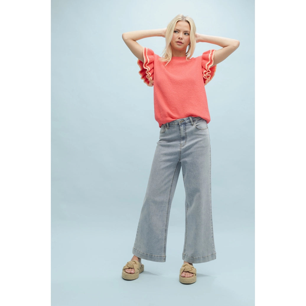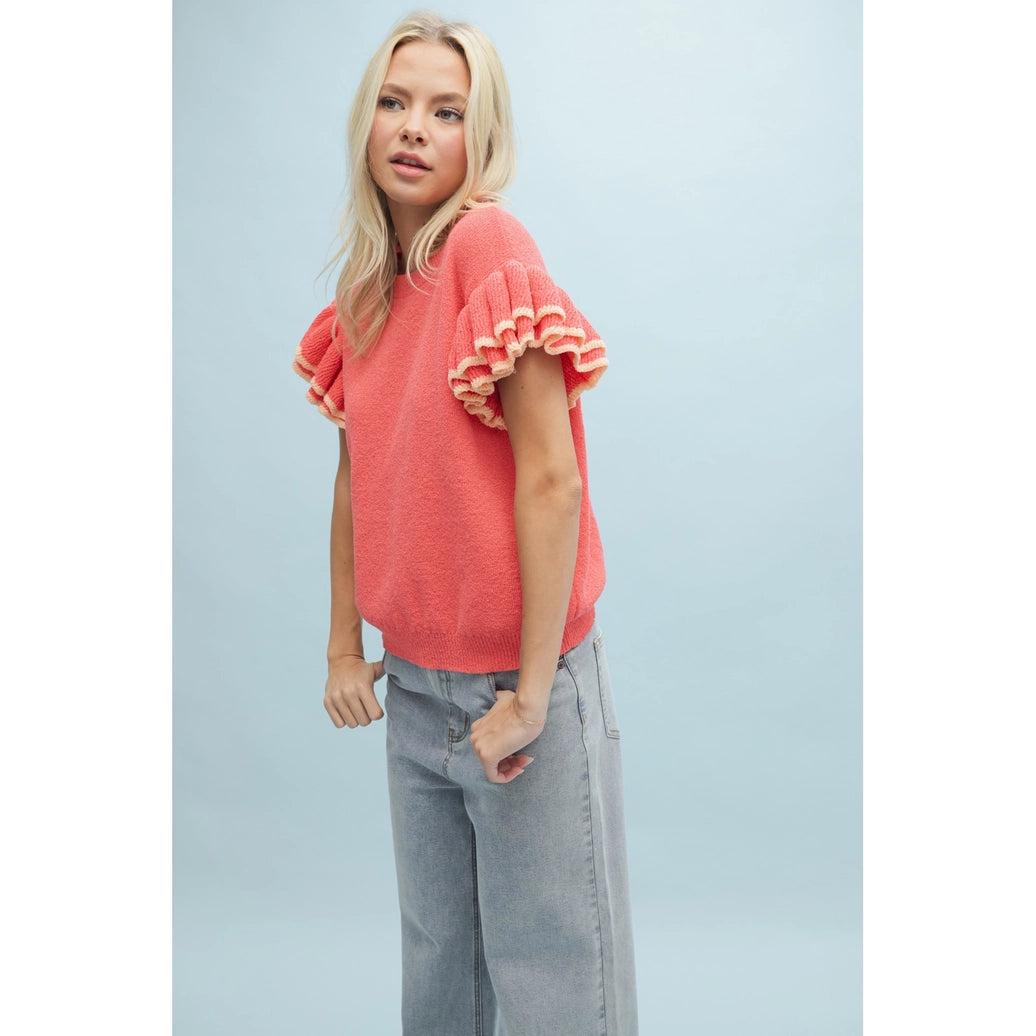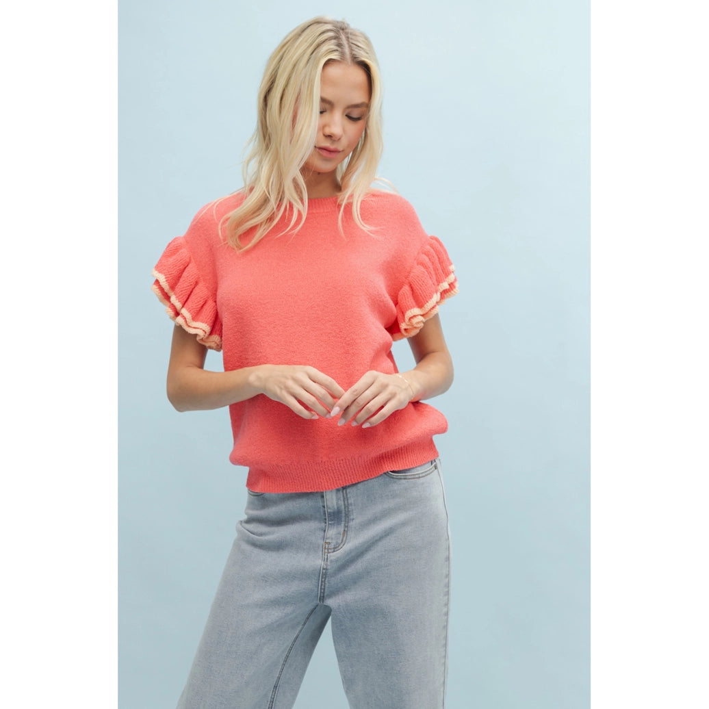 Brighten your wardrobe with this cheerful poppy pink woven top that brings instant joy to any outfit. Delicate flutter cap sleeves add a touch of feminine charm, while the vibrant citrus yellow border trim creates a playful pop of contrast. Perfect for layering or wearing solo, this piece combines comfort with eye-catching style that's sure to turn heads and lift spirits.