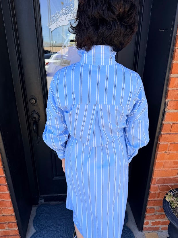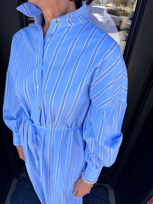 The Sierra Striped Shirt Dress combines timeless style with everyday comfort. Crafted from 100% cotton, this sky blue midi dress features delicate white and black stripes for a classic, versatile look. Long sleeves and a button-front closure offer effortless styling, while the included tie belt cinches the waist for a flattering silhouette. Perfect for work, weekend outings, or casual gatherings—a wardrobe essential that transitions seamlessly from season to season.